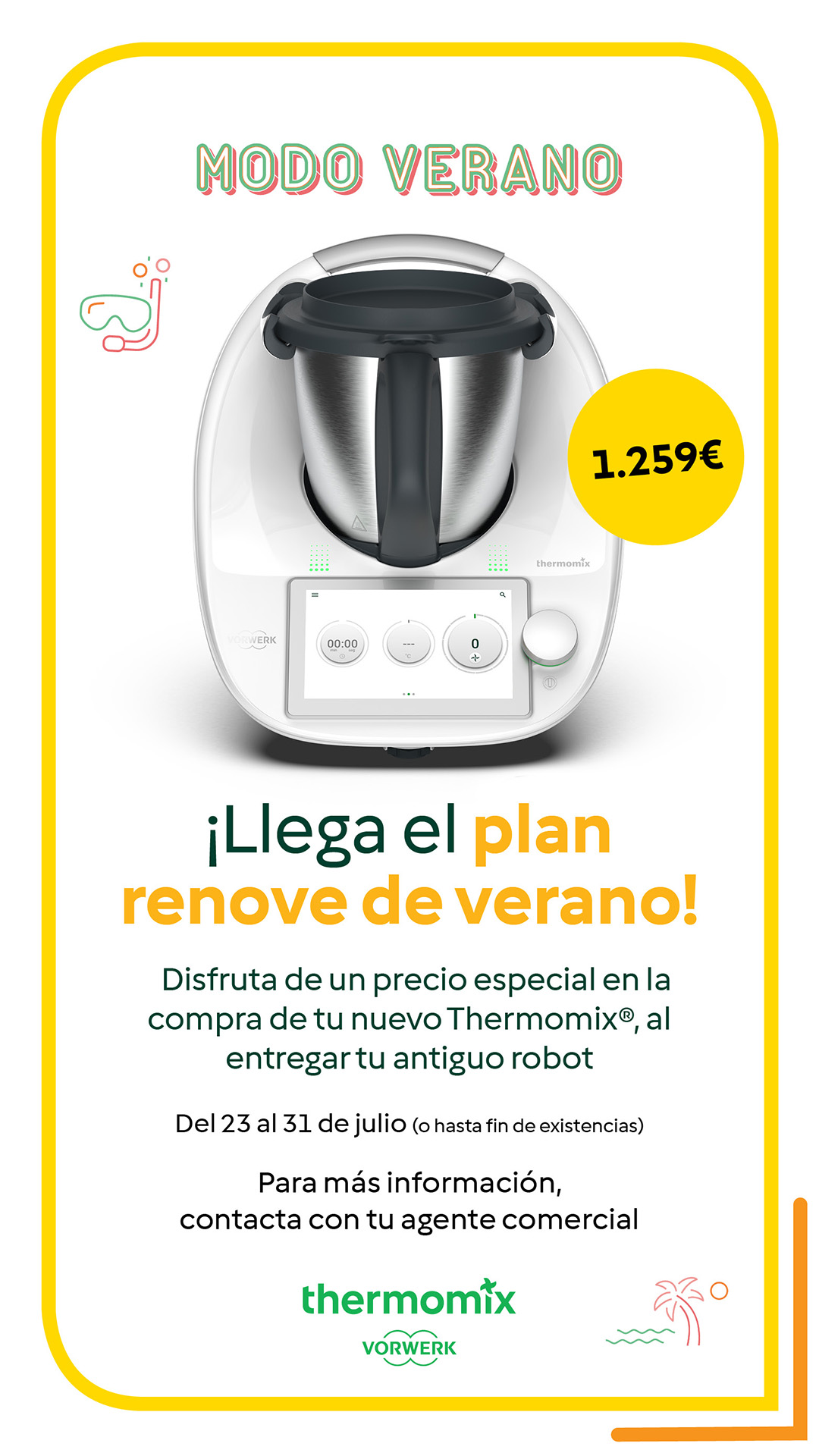 Es el momento de elegir tu cambio, esta es tu oportunidad, elige Thermomix®, por ello, todos los clientes que compren su Thermomix® TM6 desde el 23 de julio al 31 de julio de 2024 (o hasta fin de existencias) podrán conseguir al entregar su robot de cocina, un precio especial directamente sobre el Thermomix: 1.259 Euros.