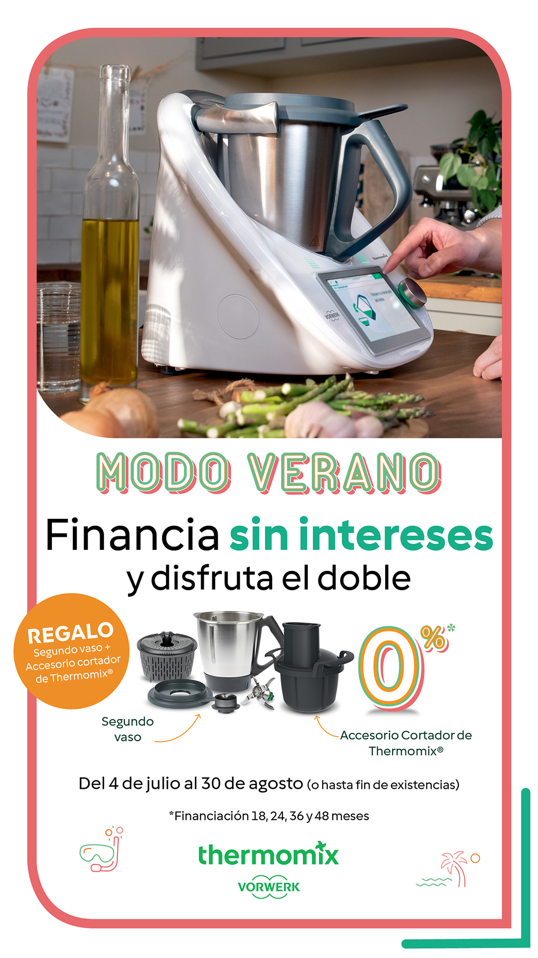 Este verano os traemos una fantástica promoción, adquiera su Thermomix TM6 desde el 04 de julio al 30 de Agosto (o fin de existencias), con un segundo vaso completo, con el accesorio cortador y con la posibilidad de financiarlo al 0% de interés.