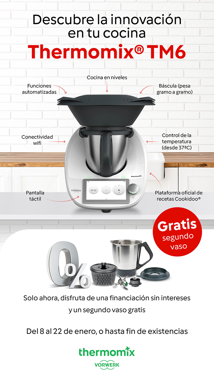 Desde el 08 al 22 de enero de 2024, o hasta fin de existencias, adquiera su Thermomix TM6 + 2º Vaso con la posibilidad de financiarlo en 24 ó 36 mensualidades sin intereses.