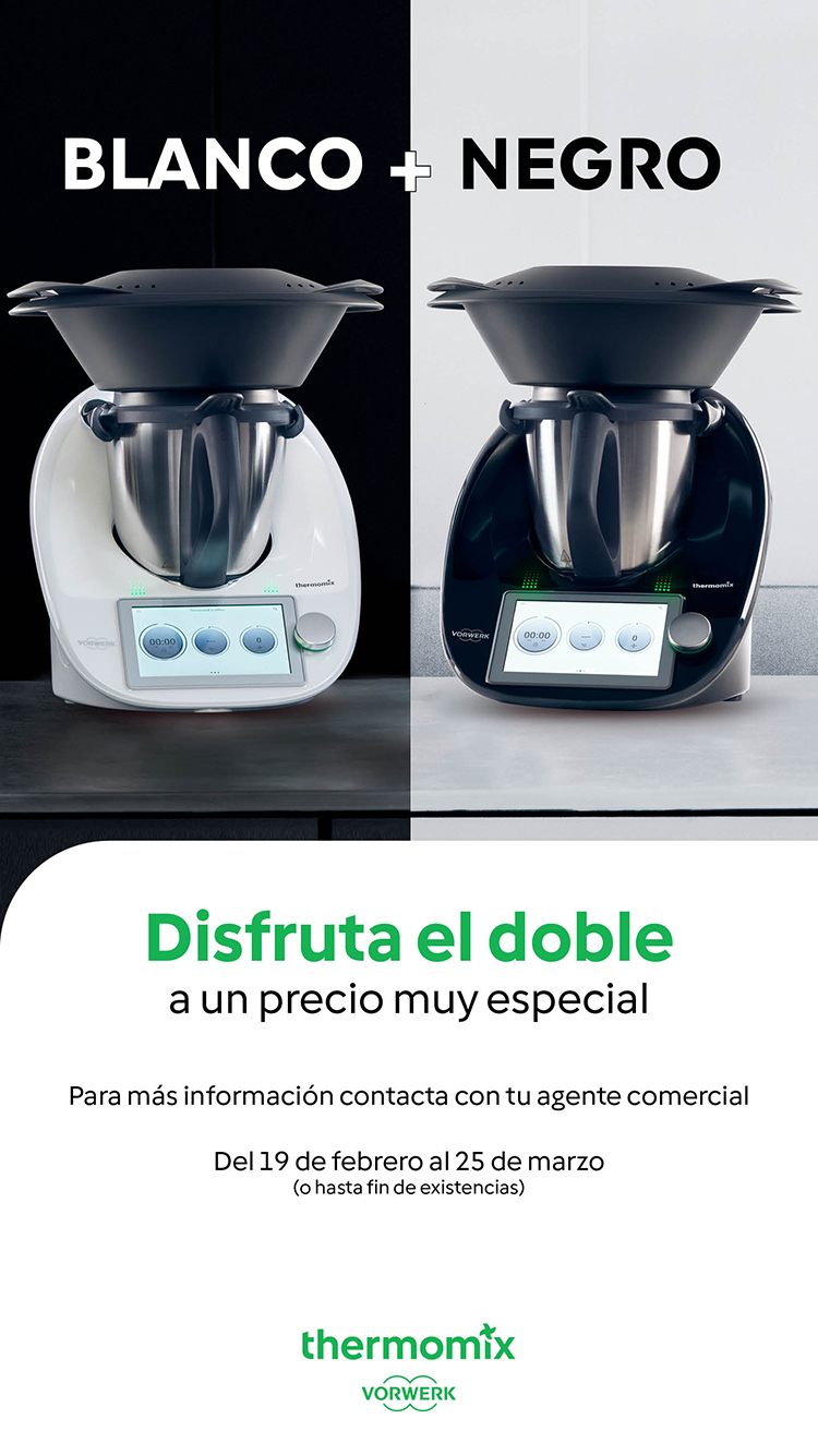 Desde el 19 de Febrero al 25 de Marzo, o hasta fin de existencias, nuestros clientes tendrán la oportunidad de adquirir un Thermomix TM6 blanco y un Thermomix TM6 negro, el primero por 1499,00 € y el segundo por tan solo 980,00€, una oportunidad única para tener este combo perfecto.